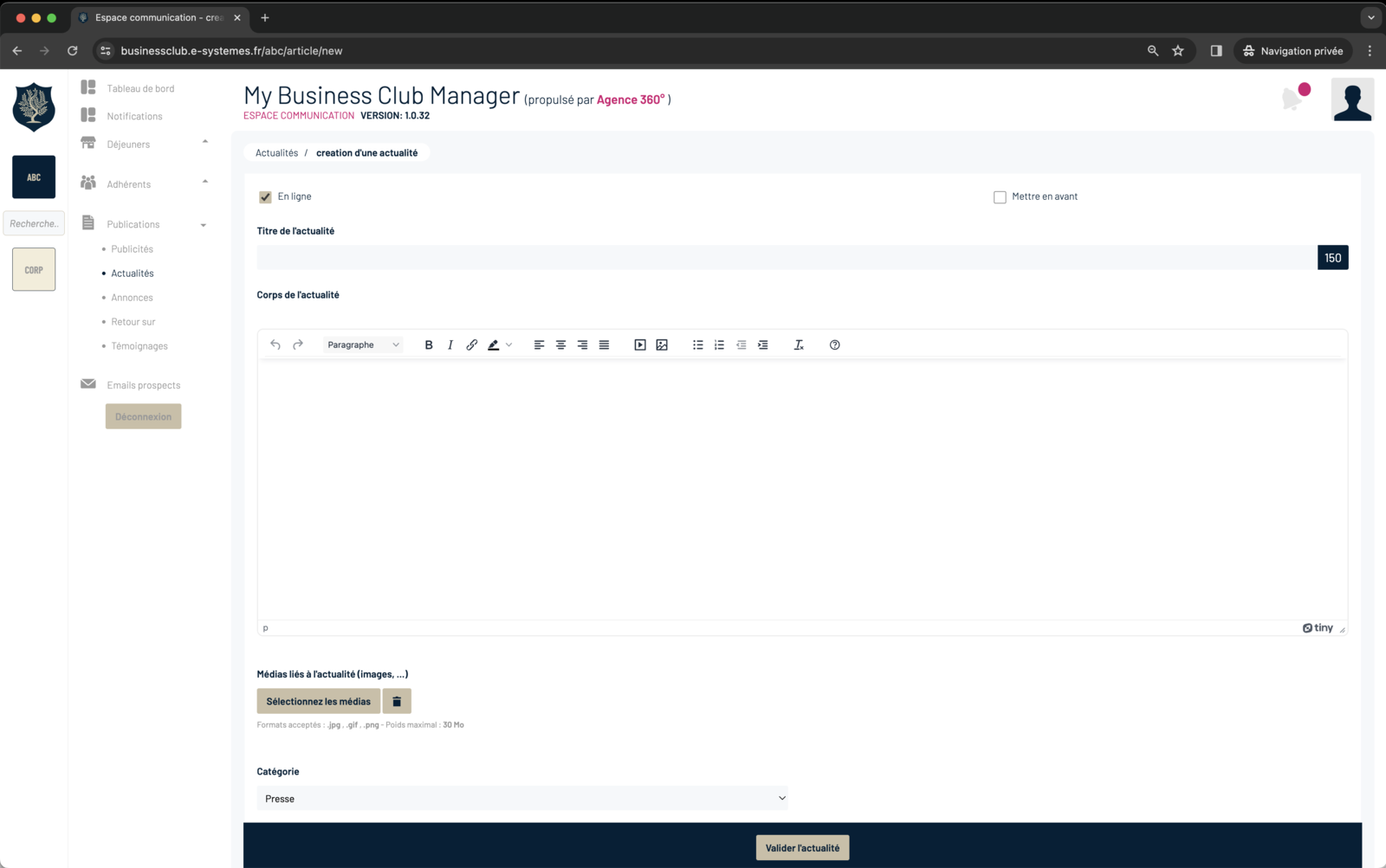 Saisissez le texte de votre actualité en vous aidant de l’éditeur de texte qui vous permet notamment d’intégrer un lien web ou un lien vers une vidéo Youtube.