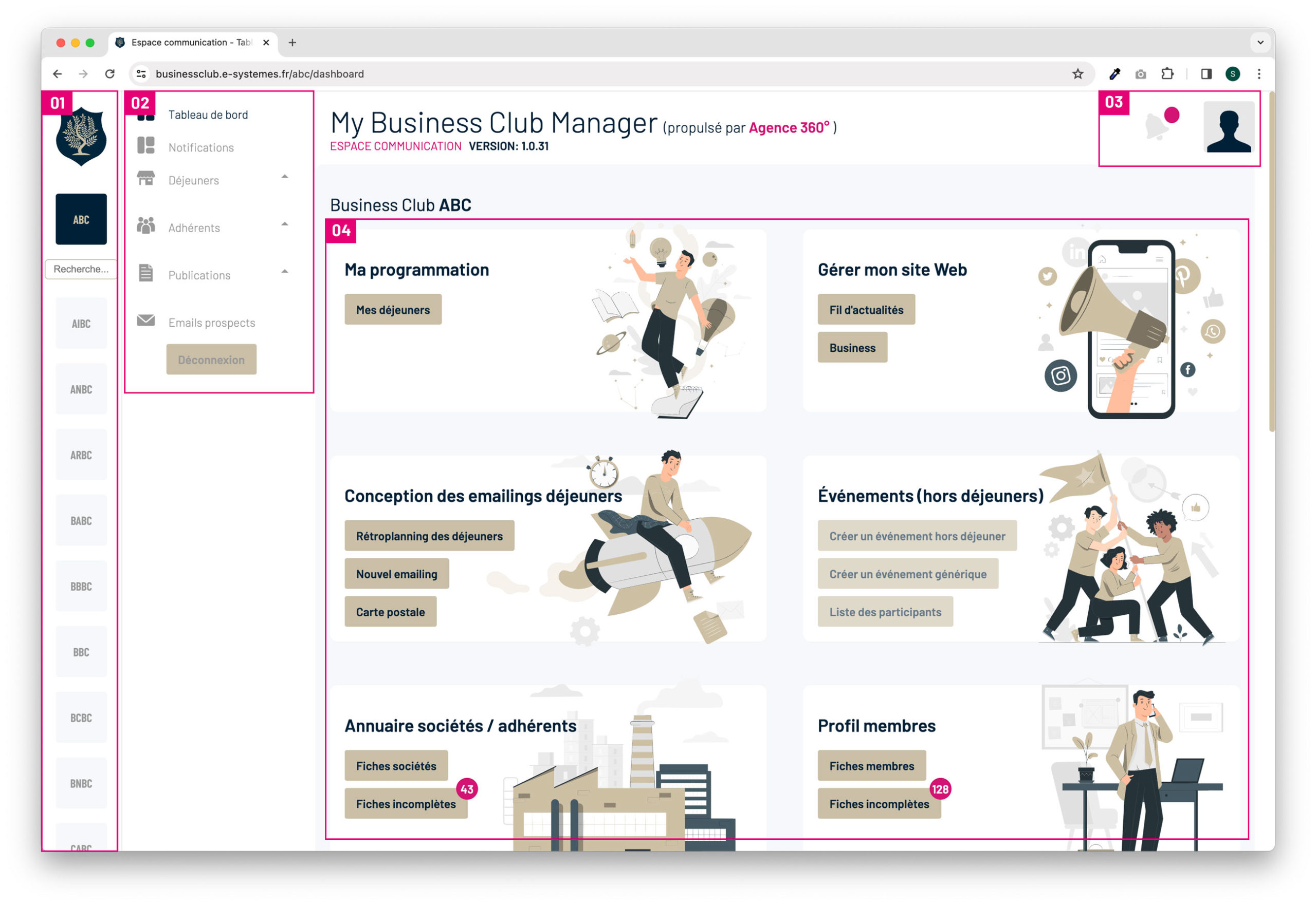 Présentation du tableau de bord Le tableau de bord est découpé en 4 sections : 1. La liste de vos clubs 2. Le menu principal 3. La zone d’alerte des dernières notifications 4. L’accès rapide aux sections. admin2024-02-26T10:18:09+01:00