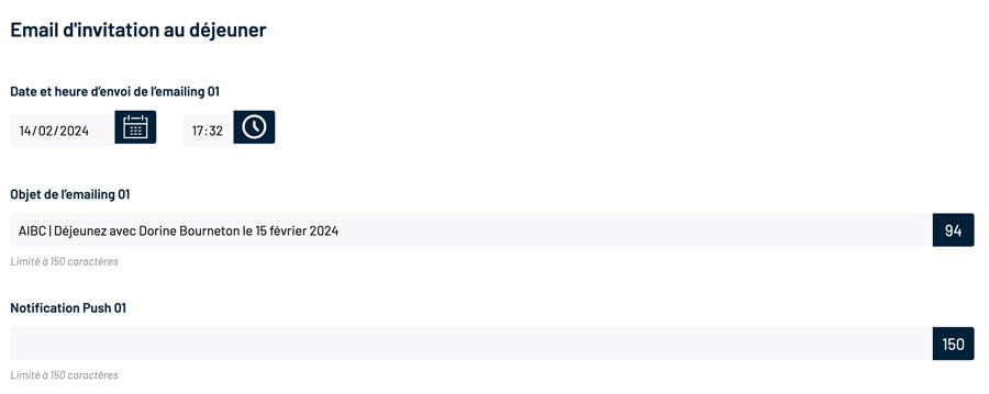 L’étape 3 reprend l’ensemble des dates des étapes de communication de votre déjeuner. Différents éléments tels que les dates et les objets sont pré-remplis par défaut. Tout est entièrement modifiable.
